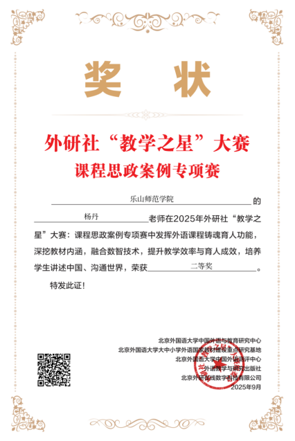 本网讯(文、图/车欢欢)2025年外研社“教学之星”大赛课程思政案例专项赛结果揭晓,BEAT365外国语学院杨丹老师获得“主赛道”二等奖;王林副教授、车欢欢副教授获得“理解当代中国”赛道三等奖。