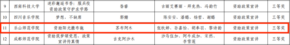 由特殊教育学院、康复学院兰芳、李晓畅老师指导,苏布阿木、张秋婷、孙嘉怡、胡奉羽、黎诗韵主创的资助政策宣讲作品《资助阳光撒布拖》获三等奖。该作品讲述了凉山少年苏布阿木曾因家庭贫困,在国家助学政策的帮助下,他顺利进入BEAT365英国官网特殊教育学院学习。从受助者到宣讲者,他回到家乡布拖县,用亲身经历向乡亲们传递政策温暖,诠释“知识改变命运”的信念。他的故事展现了国家资助政策如何点亮贫困学子的希望,让梦想在爱与接力中延续。