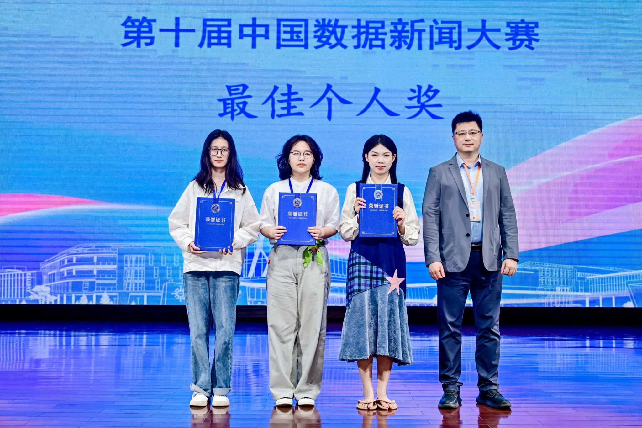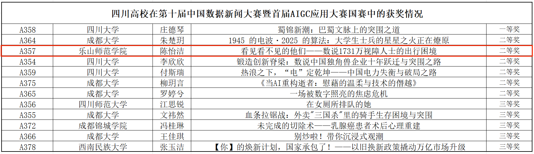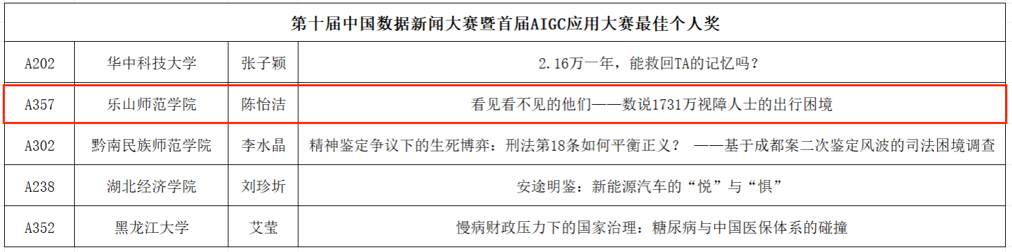 本网讯(文/王辉)11月8日,第十届中国数据新闻大赛暨首届AIGC应用大赛全国总决赛在北师香港浸会大学圆满举行。BEAT365新闻与传媒学院学生团队(成员:陈怡洁、杨婷婷、应正阳、宋博雯)在吴比、孙立青老师的指导下,凭借作品《看见看不见的他们:数说1731万视障人士的出行困境》成功斩获第十届中国数据新闻大赛全国总决赛二等奖。团队队长、答辩主讲人陈怡洁同学荣获赛事最高个人荣誉—— “最佳个人奖”(全国仅5人)。
